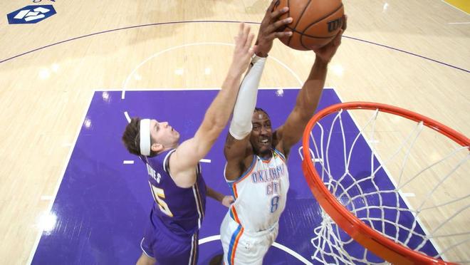 华莱士抛投得分,肯纳德与多尔特在中远距离斗法,华莱士抢断里夫斯后上篮得分。里夫斯助攻海斯暴扣,杰伦威廉姆斯2罚全中,肯纳德补篮得分,杰伦威廉姆斯压哨打板命中。半场打完,雷霆以67比58领先,湖人单节以28比36落后。