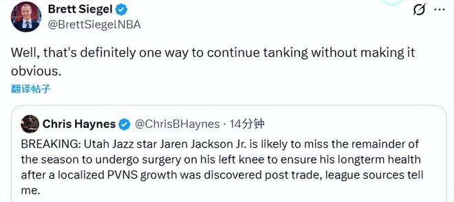 名记Haynes表示,小贾伦-杰克逊可能因此赛季报销。Siegel转发并写道:“行吧,这绝对是一种不那么露骨、却能安心摆烂的办法。”