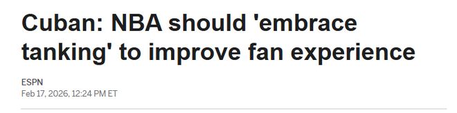 在库班看来,好的球迷体验还包括票价亲民。“最不在乎摆烂的,是那些没钱带三个孩子去看球、买不起球衣的家长。”他写道,“NBA与其管摆烂,不如先操心票价高到球迷看不起球。”