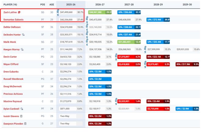 这支国王全靠37岁的拉塞尔-威斯布鲁克一人独扛,他已经鏖战52场比赛,场均29.7分钟,拿到15.3分5.7篮板6.6助攻1.3抢断0.2盖帽,命中率43%,三分命中率34.5%,来国王主场看比赛的球迷几乎都是来看他,而他年薪才363万,拉文/小萨打两场就当威少一年了。