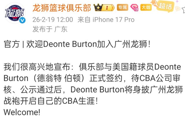 进入窗口期之后,更换外援成为CBA球队的工作重点,本赛季成绩不错的广州男篮也裁掉了第一阶段的大外援托马斯,他们官方宣布和曾经在NBA打球的伯顿完成了签约,但广州龙狮应该还会补充外援,毕竟现在的三名外援都是外线。