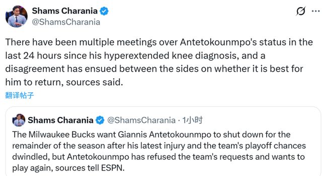 北京时间3月19日,据名记Shams报道,在字母哥再度受伤、球队季后赛希望愈发渺茫之后,雄鹿希望他直接缺席本赛季剩余所有比赛,但这位两届MVP拒绝了球队的要求,坚持想要复出参赛。过去24小时内,双方就字母哥的状况已进行多次会谈,但在最佳方案上存在分歧。Shams在节目中补充表示,这位31岁的球星态度非常坚决,执意要在本赛季复出。