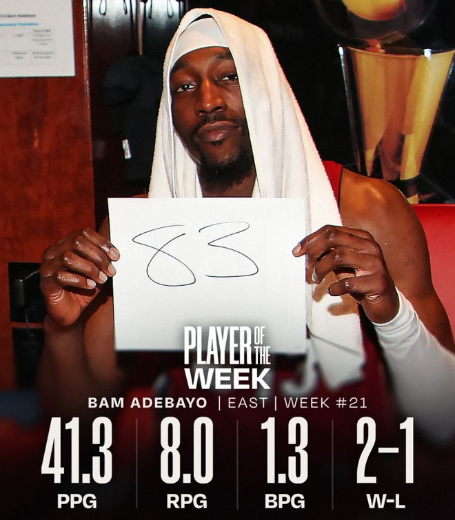 热火内线阿德巴约当选东部周最佳球员。这是他本赛季第2次、职业生涯第4次获此奖项。