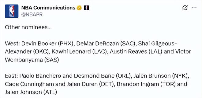 西部:布克(太阳)、德罗赞(国王)、 亚历山大(雷霆)、莱昂纳德(快船)、里夫斯(湖人)、文班亚马(马刺)。
