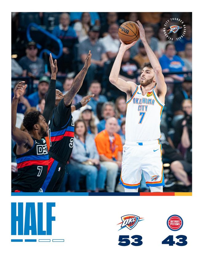 霍兰德突破开启第二节,亚历山大打3分,霍姆格伦三分命中,他们联手打出10-0的小高潮,本节进行了3分50秒时雷霆队以41-26领先。里德三分止血,詹金斯也连拿4分,活塞队把差距缩小到个位数。亚历山大还击三分,活塞队不甘示弱又追5分,他们以40-46落后。米切尔又进两球,他率队以7-3的小高潮结束第二节,雷霆队以53-43领先10分。