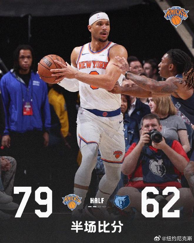 次节比赛,双方连续两节单节得分30+,继续展开对攻模式对决。尼克斯保持高效进攻效率,前两节比赛尼克斯41中29,其中三分10中7,均是达到7成准星,全队已经3人得分上双,唐斯13+7+5、布里奇斯17分与沙梅特10分。灰熊三分20中9,克莱顿与杰克逊均是10分,上半场结束尼克斯79-62领先灰熊。