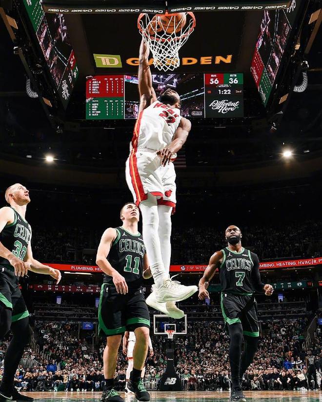 凯尔特人过去4场连赢国王、雄鹿、独行侠与火箭收获4连胜,热火上一场主场115-127输给老鹰,本赛季前两次交锋凯尔特人均战胜热火。本场凯尔特人缺少塔图姆,热火缺少希罗与罗齐尔。首节开局热火9-0领先,并在之后扩大15-2领先,热火持续三分命中继续拉开25-6领先。凯尔特人一波9-4攻势追分,首节比赛结束热火29-15领先凯尔特人。首节热火24中12,其中三分12中5,阿德巴约7中4得到10分与鲍威尔8+2+2;凯尔特人被限制24中6低迷,其中三分10中1,布朗5中0与怀特6中1均是只得到2分。