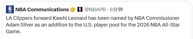 北京时间2月4日,洛杉矶快船队前锋科怀-莱昂纳德,已由NBA总裁亚当-萧华宣布增补入选2026年全明星赛美国队球员大名单。