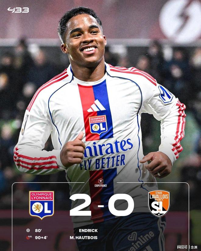 法国杯1/8决赛,里昂2-0击败法乙队拉瓦勒,晋级八强。恩德里克捅球过人禁区线前直接爆射破门,为球队首开纪录,加盟以来5场比赛贡献5球1助攻。