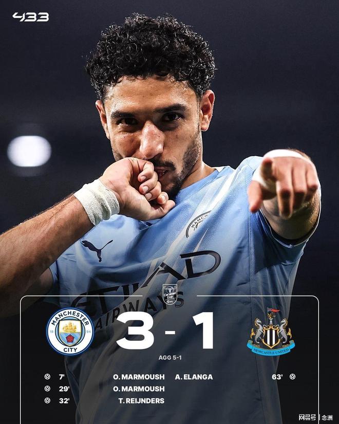 英格兰联赛杯半决赛次回合,曼城主场3-1纽卡斯尔,总比分5-1晋级决赛,将对阵阿森纳。马尔穆什梅开二度,赖因德斯破门,伊兰加扳回一球。