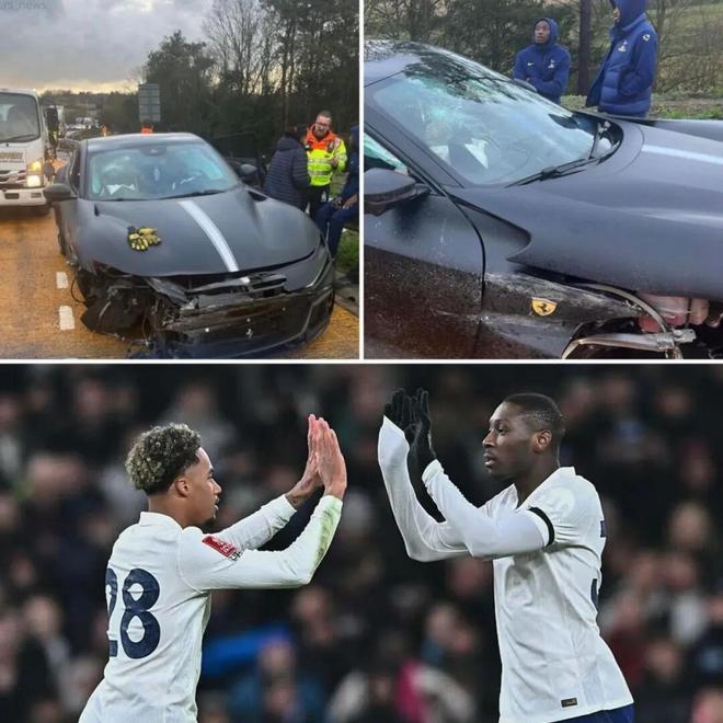 从媒体曝光的现场图片来看,穆阿尼和奥多贝尔站在路边,身旁是一辆撞毁的法拉利,车内安全气囊已经弹出,右前轮爆裂,轮毂脱落,同时车辆的轮拱和前格栅也受损。挡风玻璃也出现裂痕。交通摄像头显示,当紧急服务人员赶到现场时,两人和车辆都停靠在路肩紧急停车带。据了解,他们当时正前往斯坦斯特德机场与热刺大部队会合,准备飞往德国参加与法兰克福的欧冠比赛。