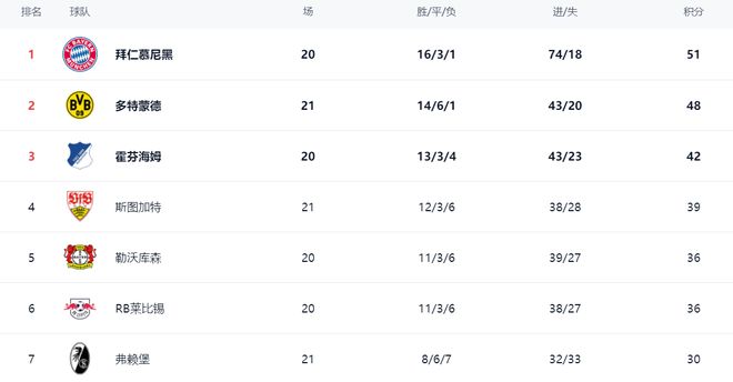 在积分榜上,拜仁依然占据榜首位置,16胜3平1负,拿到51分。而多特蒙德不断赢球之后,总积分已经达到48分,只落后拜仁3分。不过,多特蒙德比拜仁多踢1场。霍芬海姆以42分排名第3。第4的是斯图加特,拿到了39分。勒沃库森以36分排名第5。莱比锡也是36分,排名第6。勒沃库森和莱比锡与欧冠区的差距都只有3分。弗赖堡拿到30分,排第7。