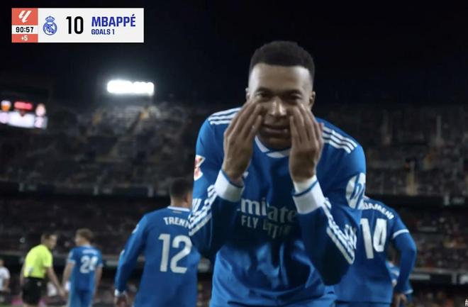 此役客场对阵瓦伦西亚,首发出战的姆巴佩在比赛第91分钟打入一球,帮助皇马取得2-0领先。