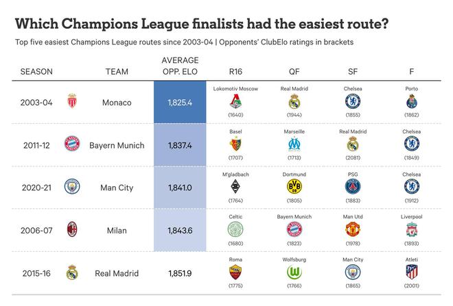 此外,皇家马德里2015-16赛季的夺冠之路被评为第五轻松的,他们在决赛中以4-1击败同城对手马德里竞技。他们晋级决赛的道路——不包括决赛本身——被评为最有利的,先后遇到了罗马、沃尔夫斯堡,以及在曼努埃尔-佩莱格里尼执教最后赛季、最终排名英超第四的曼城。