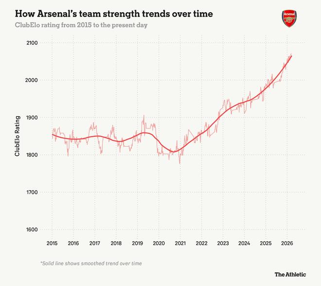 尽管并非完美无缺,但该系统目前将阿森纳评为世界最佳球队——鉴于他们本赛季在阿尔特塔执教下国内外赛场的表现,这个地位很难反驳。下图展示了自他执教以来球队的迅速崛起。