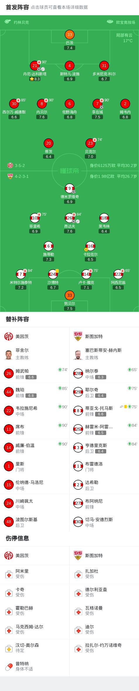 第76分钟,斯图加特球员昂达夫助攻德米罗维奇打入一球。