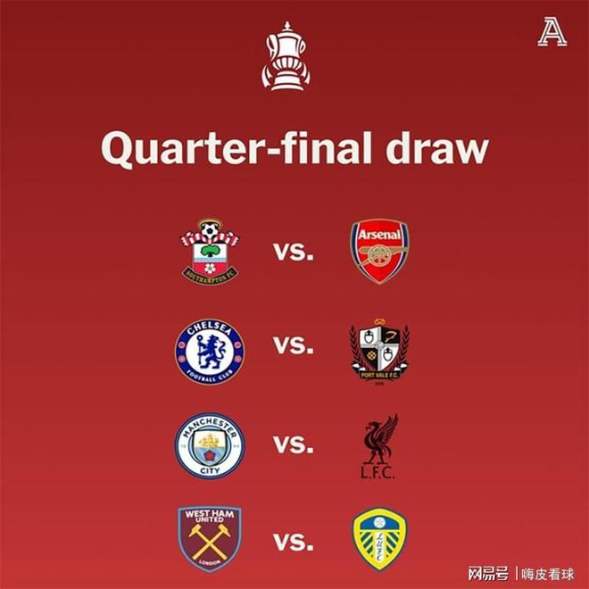 根据对阵结果,足总杯8强的4场比赛分别是,曼城主场迎战利物浦,切尔西主场迎战英甲的维尔港,西汉姆主场迎战利兹联,英冠的南安普顿主场迎战阿森纳。不得不说,阿森纳和切尔西都躲开了英超劲旅,不知道两队会不会又在半决赛碰面?