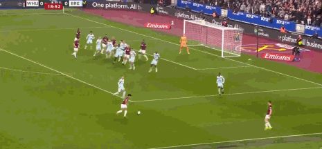 第20分钟,先拔头筹,鲍恩门前得分,西汉姆联1-0