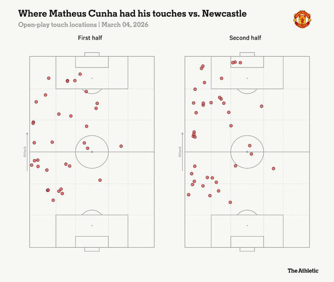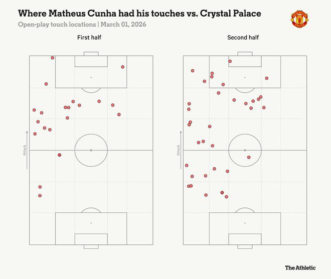 下半场,在水晶宫被罚下一人后,曼联有所改观,部分原因在于库尼亚开始在更深、更靠边的位置接球。