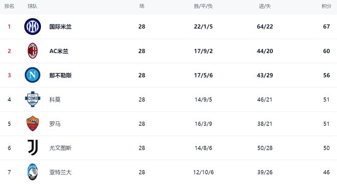 在积分榜上,国际米兰依然占据榜首位置。国际米兰22胜1平5负,拿到67分。AC米兰赢球之后,总积分达到60分,排名第2。这场胜利让AC米兰冲击冠军看到了希望,毕竟差距缩小了,只落后7分。如果这场焦点战AC米兰落败的话,差距会达到13分,但事实是AC米兰赢下来了,让冠军争夺依然有悬念。那不勒斯以56分排名第3。第4的是科莫,拿到51分。落败的罗马依然是51分,排名第5。尤文图斯以50分排名第6。