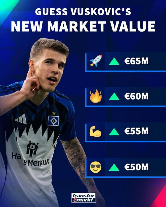 北京时间3月17日,德转预热了托特纳姆热刺外租汉堡的年轻中卫卢卡-武什科维奇的身价更新,他们给出了四个上涨选项,最高涨至6500万欧元。