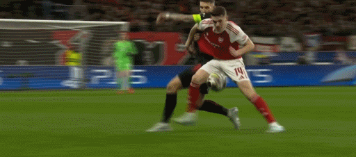 第13分钟,加布里埃尔被断球,赖斯回追破坏