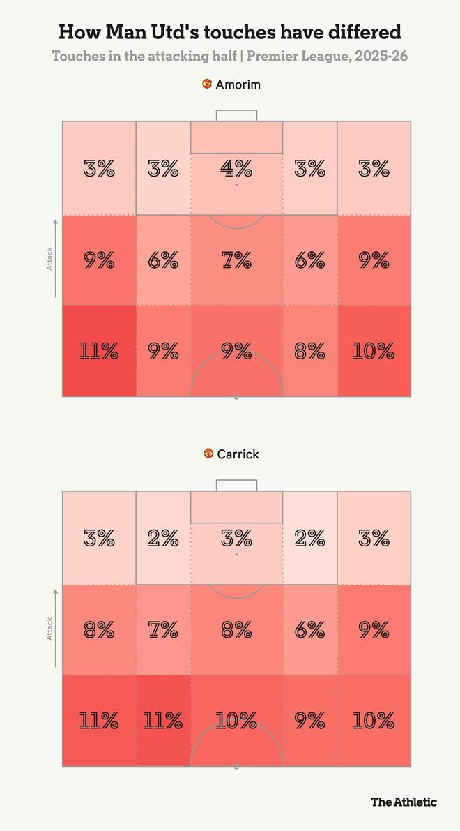 这一变化在数据中体现得较为细微,但下方进攻半场的触球热图显示,卡里克麾下的球队比阿莫林时期更频繁地在肋部区域活动。