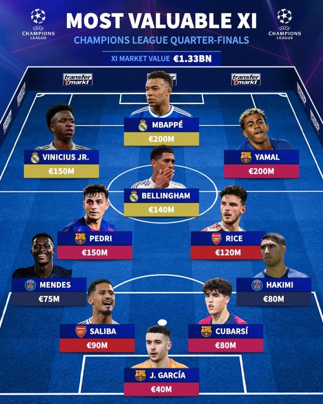 北京时间4月7日,在欧冠1/4决赛首回合的比赛即将打响的情况下,德转列出了参加1/4决赛最贵的11人阵容,姆巴佩和亚马尔2亿欧元领衔,巴塞罗那4人入选,皇家马德里3人,阿森纳和巴黎圣日耳曼各有2名球员上榜。