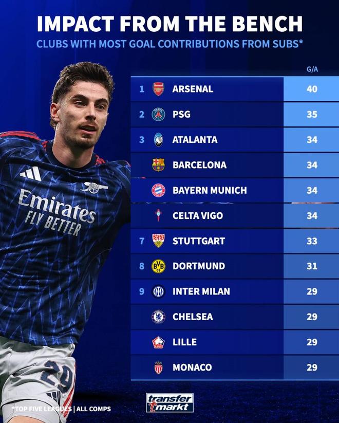 北京时间4月8日,德转统计出了本赛季至今欧洲五大联赛球队替补球员在各项赛事中直接参与进球数的排行榜,阿森纳以40球排名第一,巴黎圣日耳曼35球第二,巴塞罗那和拜仁慕尼黑34球并列第三。
