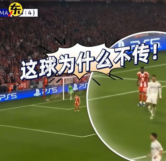 与此同时,贝林厄姆已高速前插至禁区腹地,精准卡位接应点,并连续高举双臂示意传球,姿态明确、位置理想。然而维尼修斯选择坚决突破,执意完成个人终结。