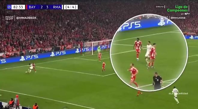 当时比赛进行到第82分钟,双方总比分4-4平,局势十分胶着,只要拜仁进球皇马随时会被淘汰出局。