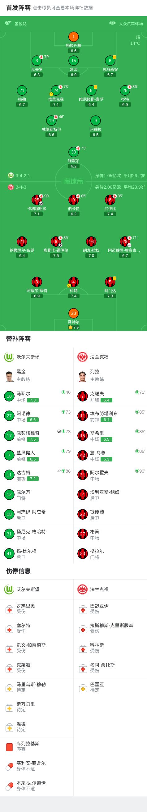 北京时间4月11日德国足球顶级联赛 联赛 第29轮,沃尔夫斯堡主场对阵法兰克福。沃尔夫斯堡佩契诺维奇破门。法兰克福奥斯卡-霍伊伦破门,卡利穆恩多破门。最终比分沃尔夫斯堡 1-2 法兰克福。