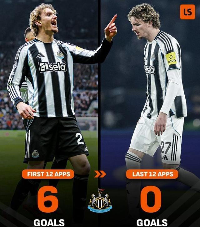 据统计,沃尔特马德在代表纽卡斯尔联的前12场比赛中打进6球,但在过去的12场比赛中,他颗粒无收。他上一次进球还是在英超第17轮对切尔西的比赛中上演的梅开二度。